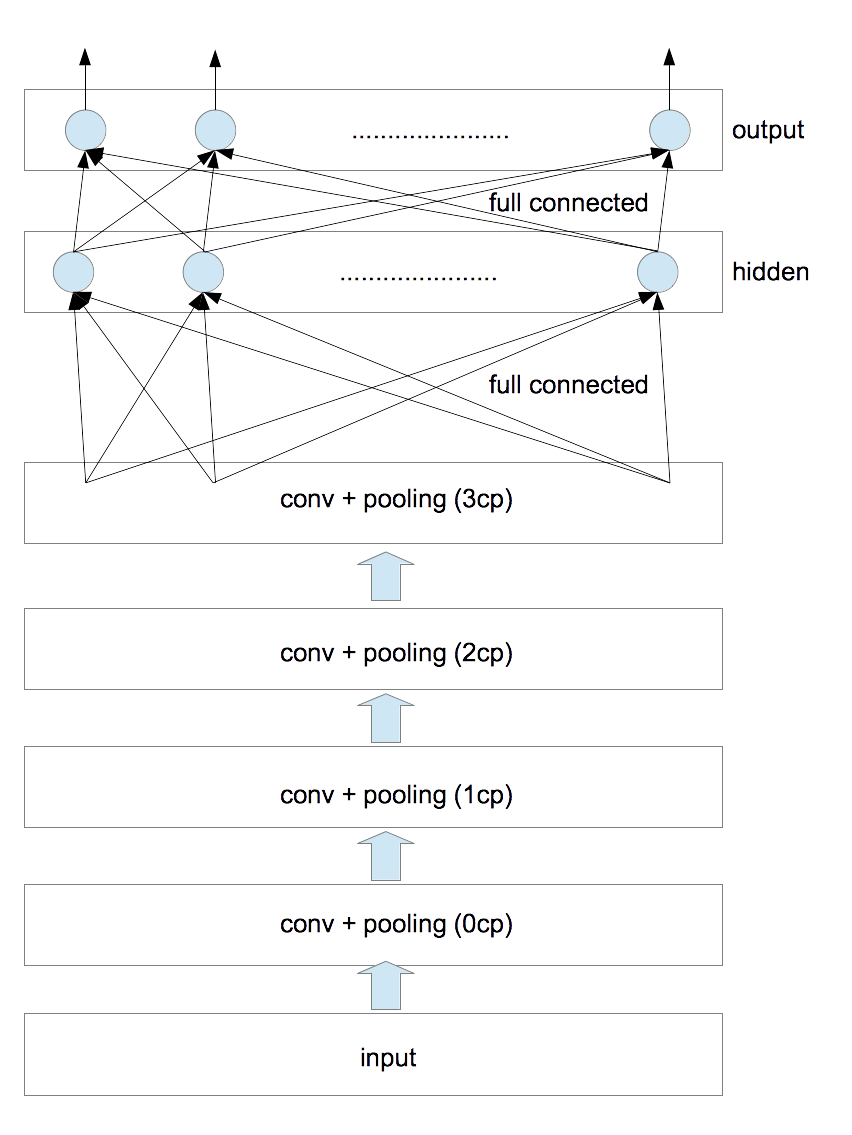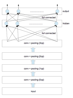 今回使用したネットワークの構造は以下の通りである。 convolutional 層と pooling 層の対を4つ、隠れ層を1つとした。 各種パラメータは以下の通りである。