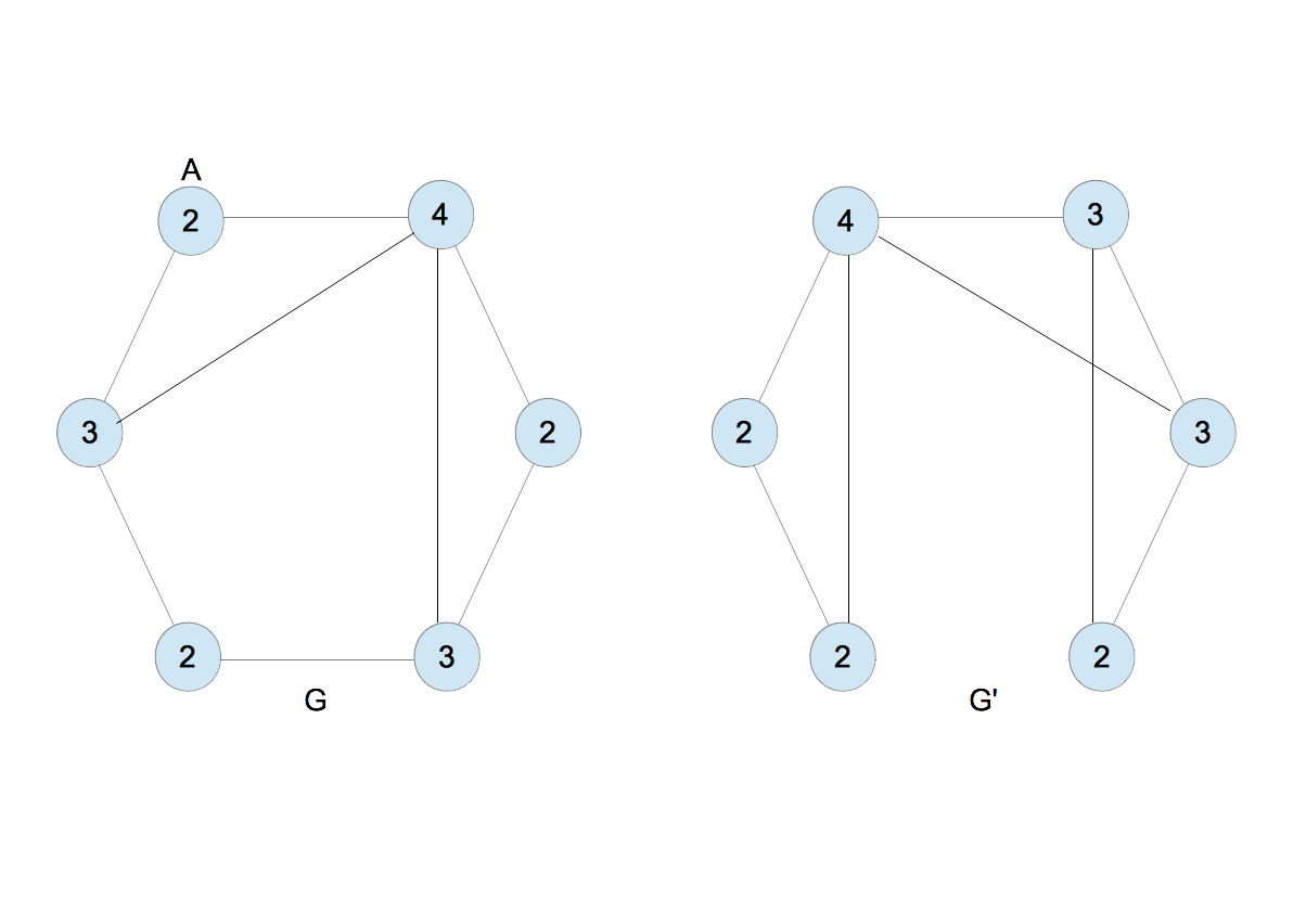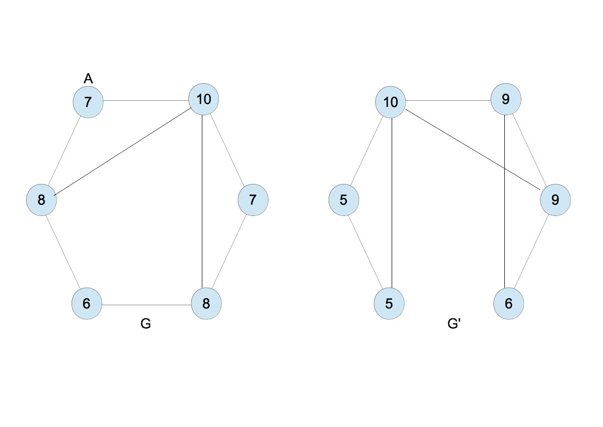 - 図7のとき、$G$のラベルは$\{6,7,7,8,8,10\}$、$G^{\prime}$のそれは$\{5,5,6,9,9,10\}$となり、これらは異なる。異なるとき終了する。ただし、何回繰り返しても終了しない場合があり得るので、あらかじめ適当な繰り返し数の上限を決めておく。