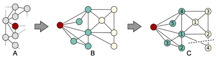 - $v$(赤丸)を中心に近傍ノードを集める(図17A)。
