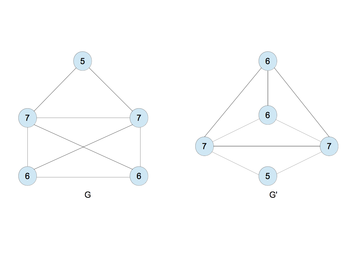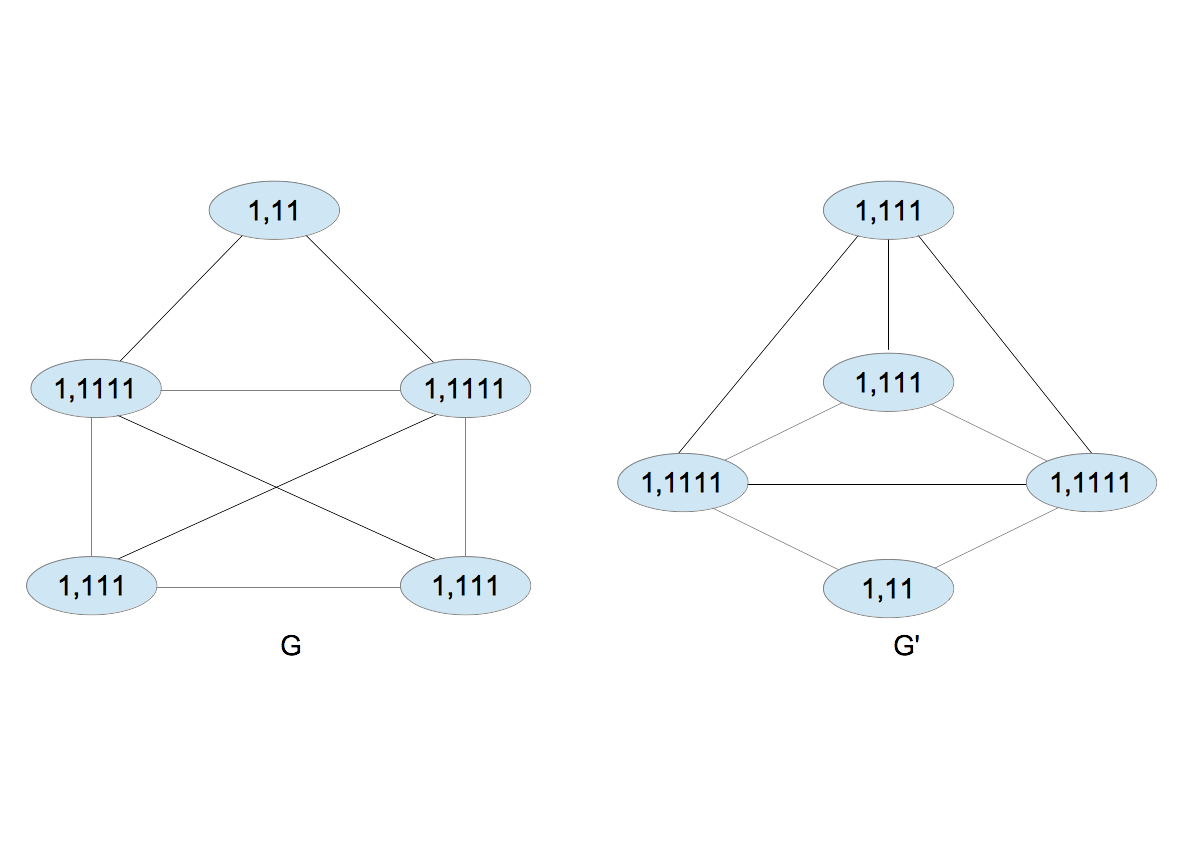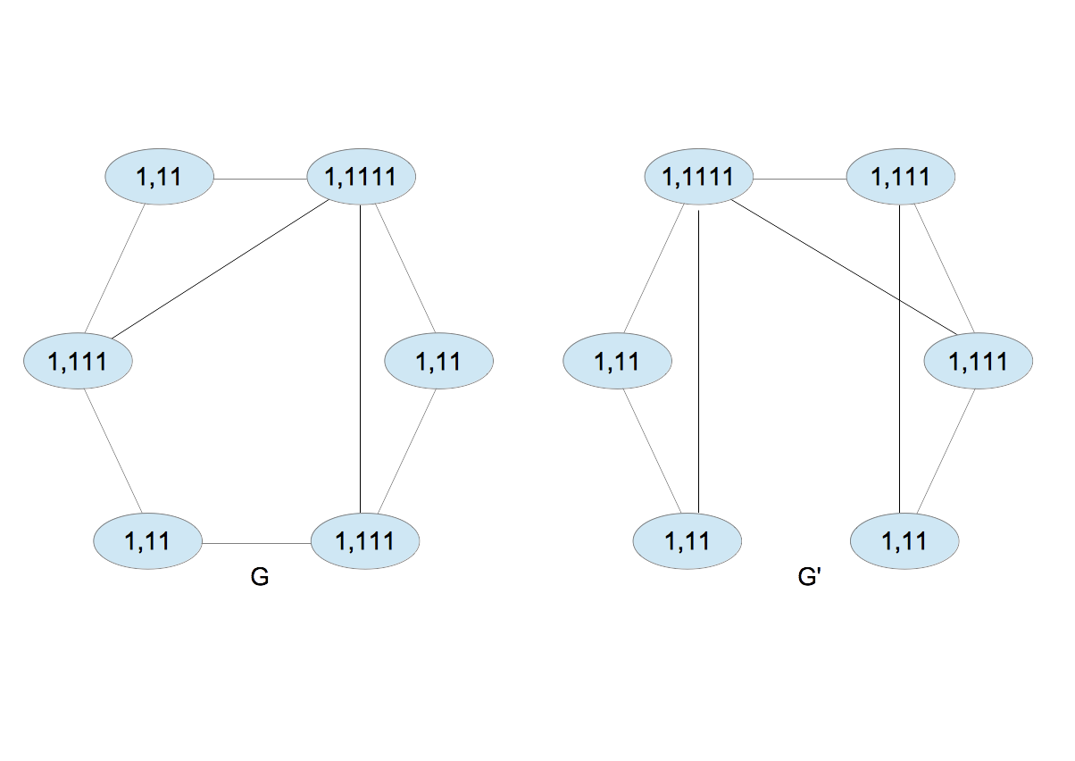 - 図7のとき、$G$のラベルは$\{6,7,7,8,8,10\}$、$G^{\prime}$のそれは$\{5,5,6,9,9,10\}$となり、これらは異なる。異なるとき終了する。ただし、何回繰り返しても終了しない場合があり得るので、あらかじめ適当な繰り返し数の上限を決めておく。