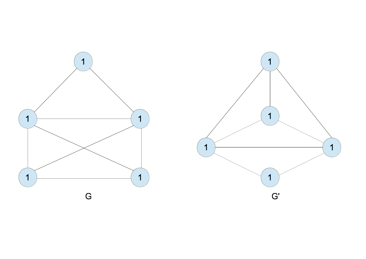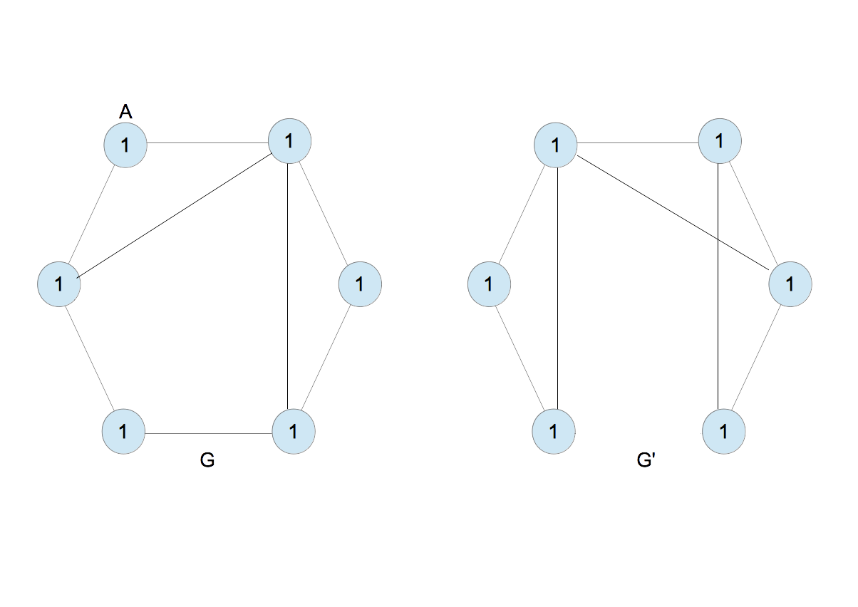 - 2つのグラフ$G$と$G^{\prime}$を考える。最初に各ノードに1を割り振る(図3)。